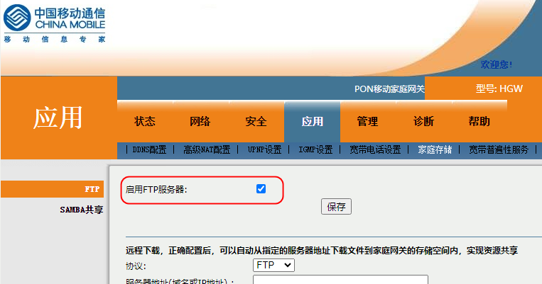 2、使用CMCCAdmin用户登录web页面,密码是aDm8H%MdA (或者),在家庭存储中打开samba与ftp功能;