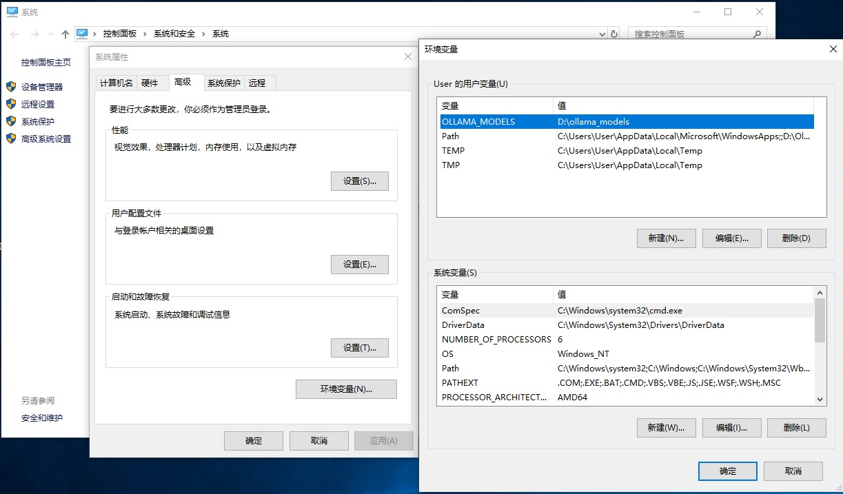 按 Win + R,输入 sysdm.cpl (或者右击 桌面 上的 此电脑 图标的 属性),打开 系统属性->切换到 高级 选项卡,点击 环境变量 -> 在 用户变量 或 系统变量 中,点击 新建 -> 变量名:OLLAMA_MODELS ->变量值:D:\ollama_models(或你想要的路径)-> 点击 确定 保存 ->重启电脑使设置生效。