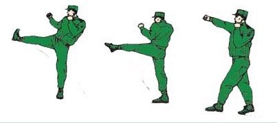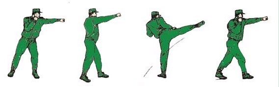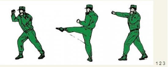 动作要领:右前蹬,接左腿弹踢,左脚落步,出右直拳(不收回),目视前方。如下图: