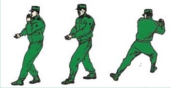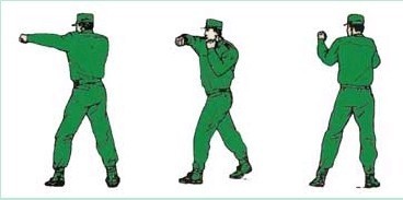 动作要领:进步左直拳,接右摆拳,接左色拳(不收回)两眼目视前方。如下图: