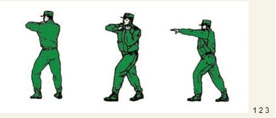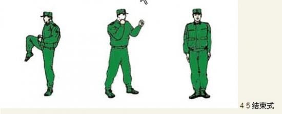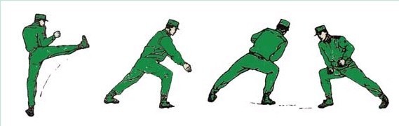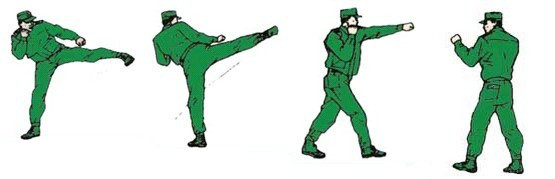 动作要领:左直拳,接右直拳,接右横踢,右脚落步,出左直拳(不收回),右拳置于下颌,两眼目视前方。如下图: