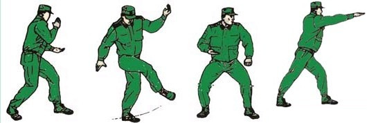 动作要领:右摆拳,接左直拳,接左侧踹,左脚落步,出右直拳(不收回),两眼目视前方。如下图: