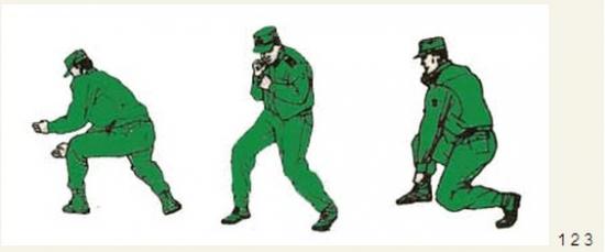 动作要领:进步的同时,身体下潜,两腿弯曲,两手变掌下插,左手在上(与膝同高),右手在下(与小腿同高),掌心相对;身体向右后转体270度的同时右脚上步,两掌变拳上提后拉于胸前,上体前俯,随即左膝下跪,左拳下击与左膝同高,右拳置于下颌,两眼目视下方。如下图: