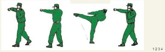 动作要领:身体向右后转体的同时,右上格挡;左腿弹踢,左脚落步,出右直拳(不收回),目视前方。如下图: