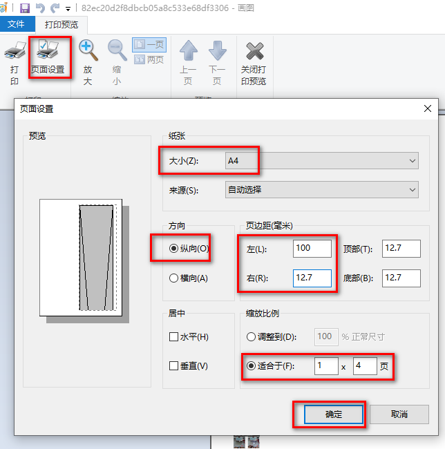 3、先 页面设置中 设置 打印A4 纸,纵向 ,分两栏就要把右边距设置为100,在适合于 设置 1 x 4,这里适合于根据左图缩略图看效果,然后确定,最关键是在打印时设置为只打印 奇数页