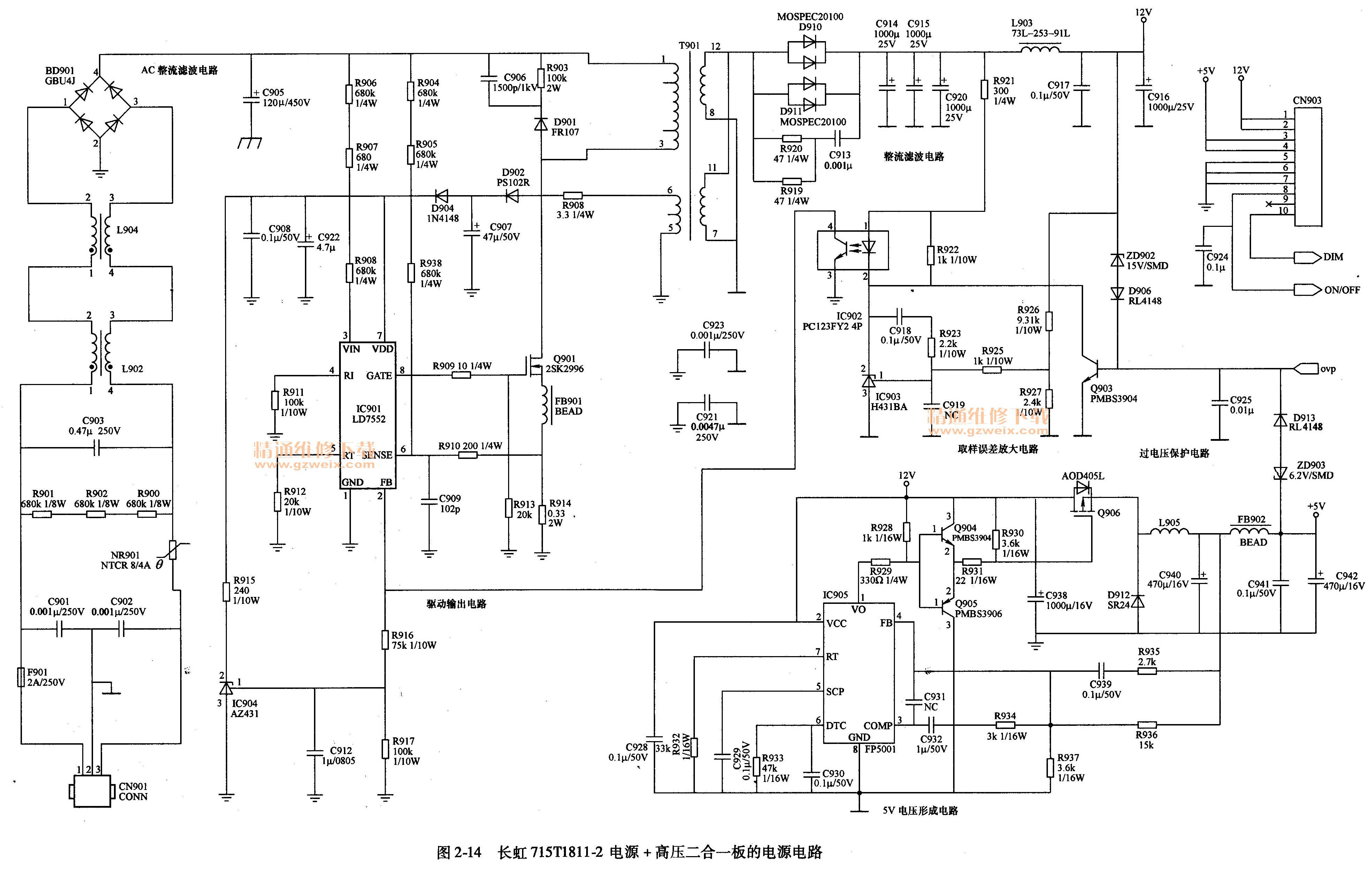 长虹715TI811-2电源+高压二合一板实物图解如图2-13所示;电源电路如图2-14所示,由驱动控制电路IC901 (LD7552), MOSFET开关管Q901 (2SK2996 )、开关变压器T901、取样误差放大电路IC903 ( H431 BA)、光耦合器IC902 (PC123FY24P)等元器件组成主开关电源,输出12V电压,再经+5V电压形成电路产生+5V电压,通过连接器CN903向主电路板和背光灯电路提供12V和+5V电压。