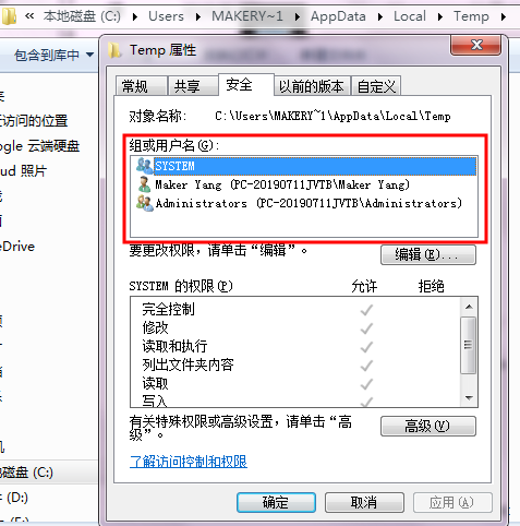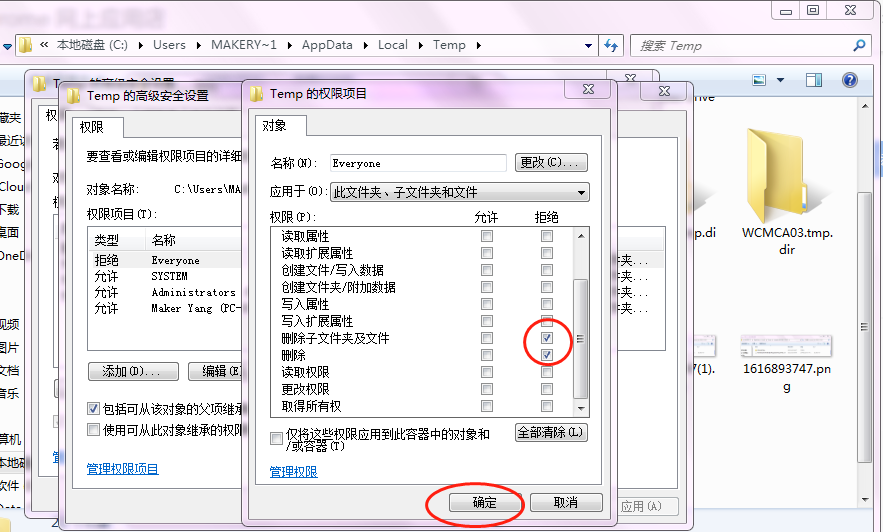 6、记得还原在%tmp%目录下的安全设置,在安全导致中把everyone移除掉,最后向如下的设置: