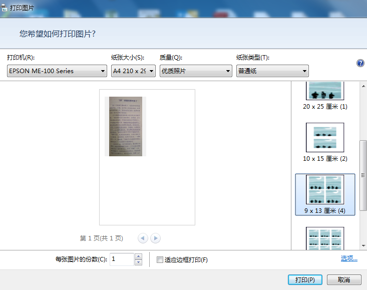 原因分析:可能是电脑系统缓存处理大压缩JPG图片格式时溢出引起故障,用四张图片打印到一张A4纸预览正常。