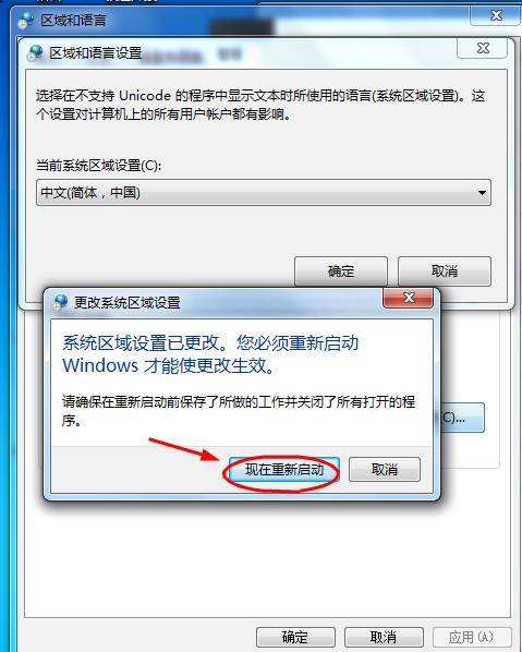 3、在当前系统区域设置 里面 改成 “中文(简体,中国)”,然后确定重启即可。