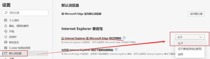 在下拉框中更改为仅不兼容的网站,使用IE浏览器即可正常打开网页。